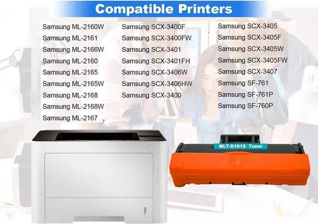 5. For use in Samsung SCX-3405, Samsung SCX-3405F, Samsung SCX-3405W, Samsung SCX-3405FW, Samsung SCX-3401, Samsung SCX-3401FH, Samsung ML-2160, Samsung ML-2161, Samsung ML-2166W, Samsung ML-2160, Samsung ML-2165, Samsung ML-2165W, Samsung ML-2168, Samsung ML-2168W, Samsung ML-2167, Samsung SCX-3400F, Samsung SCX-3400FW, Samsung SCX-3401, Samsung SCX-3401FH, Samsung SCX-3406W, Samsung SCX-3406HW, Samsung SCX-3400, Samsung SCX-3407, Samsung SF-761, Samsung SF-761P, Samsung SF-760P.