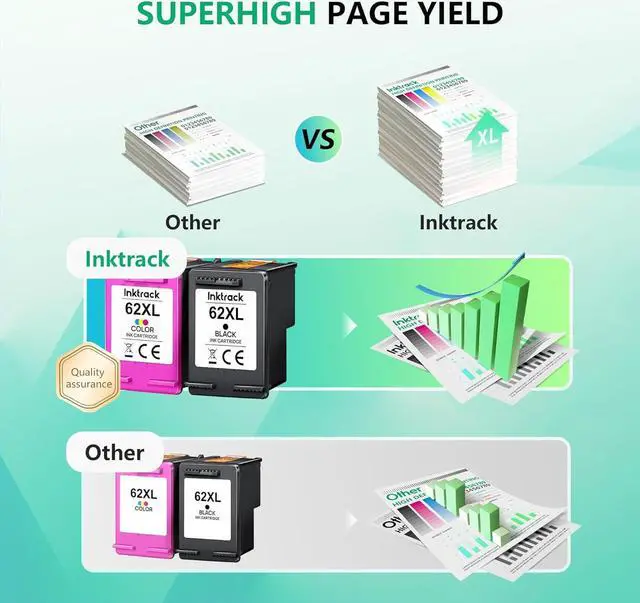 With Latest Upgraded Chips: All Inktrack 62XL ink cartridges are equipped with intelligent chip that allows you to track ink levels anytime. Each 62XL ink cartridge is remanufactured from ISO 9001 certified facility to ensure smooth use with your printer ink 62xl