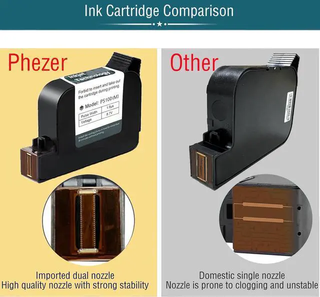 [Quick-Drying Ink Cartridge]: Phezer uses imported industrial-level of quality ink cartridges, achieving real quick drying on all printing surface. With the high quality nozzle, the printing is Smooth, Brightly and stable.