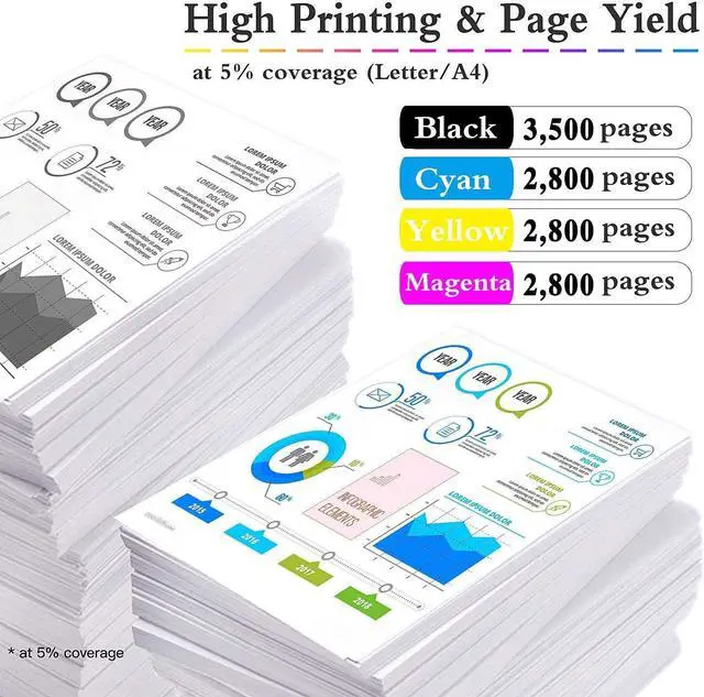 High Yield:Each black can print approx 3,500 Pages and color can print approx 2,800 Pages, based on 5% coverage (Letter/A4). Lower cost, more printing.