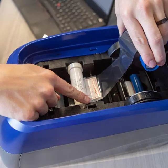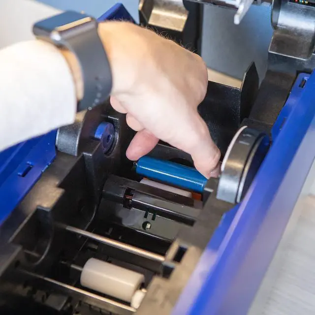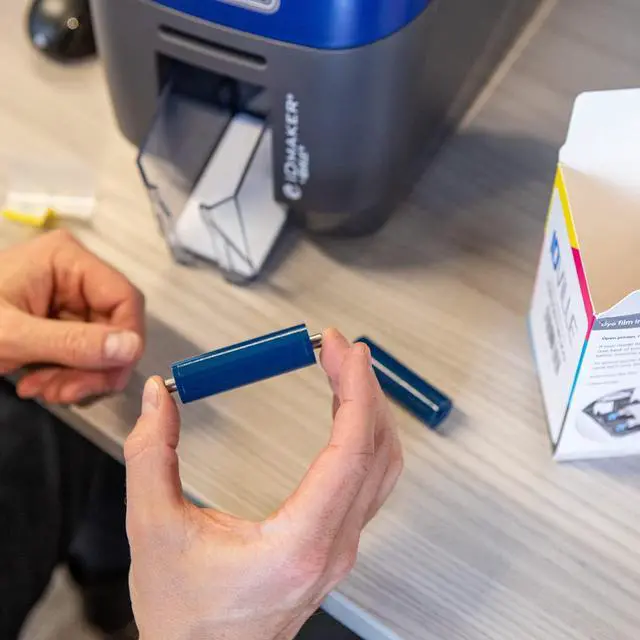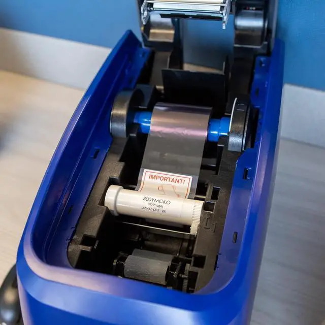 CLEANING SPOOL INCLUDED A blue adhesive cleaning spool in included with the ribbon. We recommend replacing this during every ribbon change to reduce dust getting stuck under your id badge print from being on the blank card.