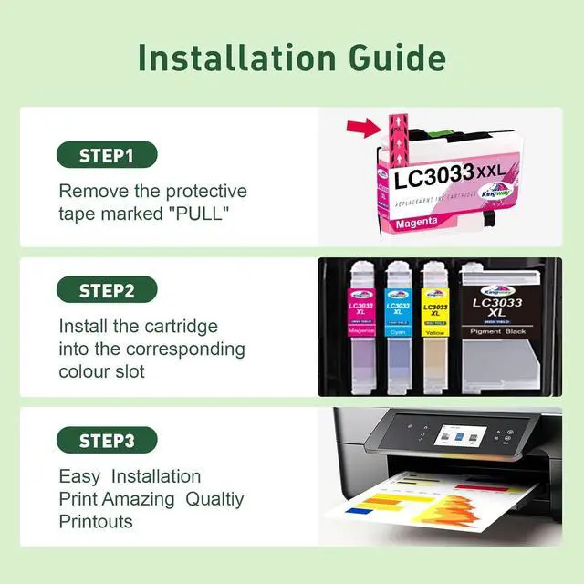 Exceptional Print QualityKingway compatible ink cartridges replacement for brother ink cartridges lc3033 lc3035, deliver sharp, vibrant, and professional-quality prints that are sure to impress. Whether youre printing documents, photos, or artworks, expect outstanding clarity and detail.