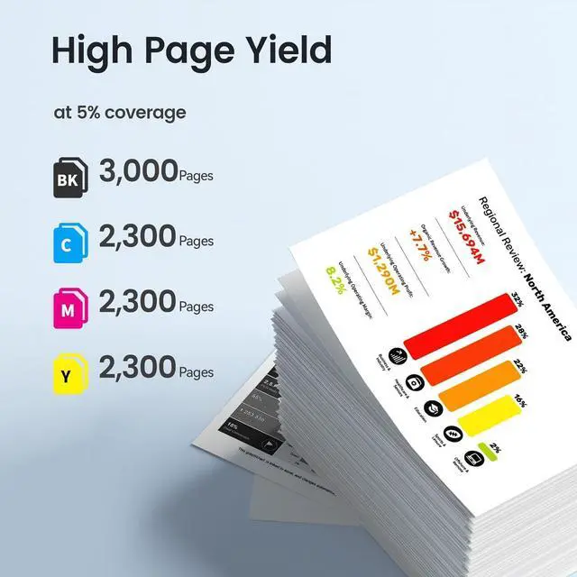 High Page Yield: Black ink is 3000 pages & color is 2300 pages per cartridge at 5% coverage on letter/a4