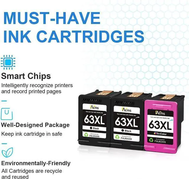 Feature: Smart chips to ensure identify your printer intelligently. Strictly test to comfirm the compatibility of remanufactured 63xl ink cartridges black and color. Well-package keeps 63XL black ink cartridge in good condictions.