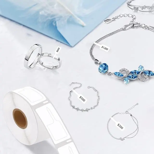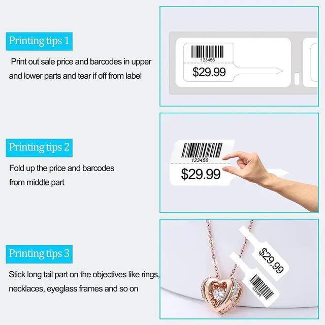 Easy to Use 1.Print out sale price and barcodes in upper and lower parts and tear it off from label; 2.Fold up the price and barcodes from middle part; 3.Stick long tail part on the objectives like rings, necklaces, eyeglass frames and so on. Powerful adhesive that are used to make it sticky and long lasting. You can write anything as your needs.
