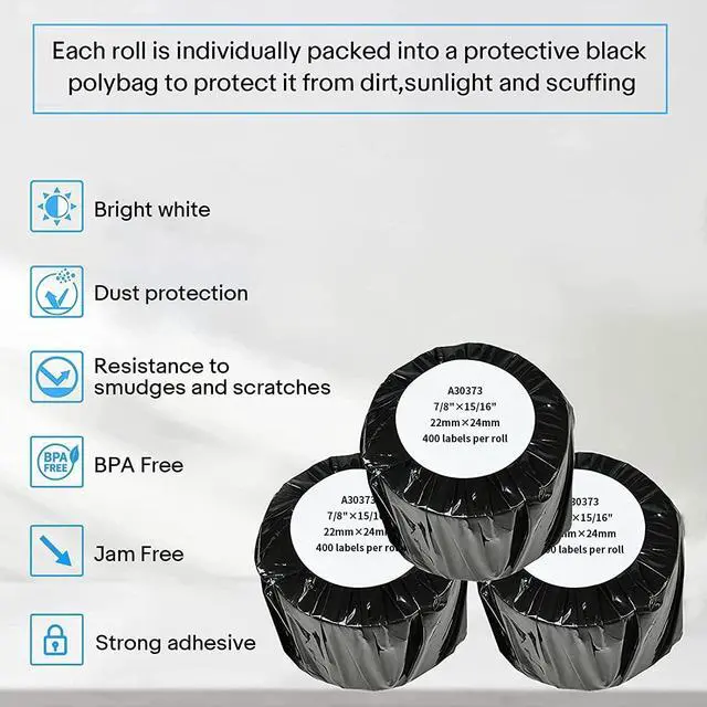 Cruxer 30373 Labels Specification Amount: 400 labels per roll; Color: White; Dimension: 7/8" x 15/16" (22mm x 24mm); Smudge-proof, Water and Oil Resistant,Fade-resistant, Direct Thermal, Permanent Adhesive, BPA Free.
