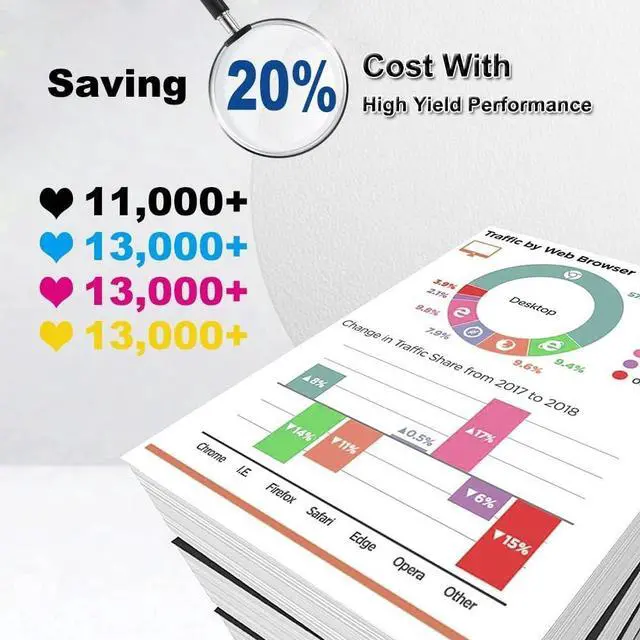 High Page Yield: More 20% than others 11,000 pages / Black and 13,000 pages / color, per cartridge