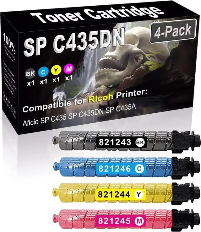 Package included: 4-pack Compatible SP C435DN | 821243 821246 821244 821245 Toner Cartridge (1 Black, 1 Cyan, 1 Yellow, 1 Magenta, Total)