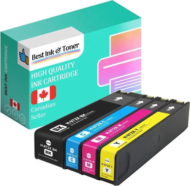 4 Pack Replacement Ink Cartridge for HP 972X High Yield Black (F6T84AN); Cyan (L0R98AN); Magenta (L0S01AN); Yellow (L0S04AN).