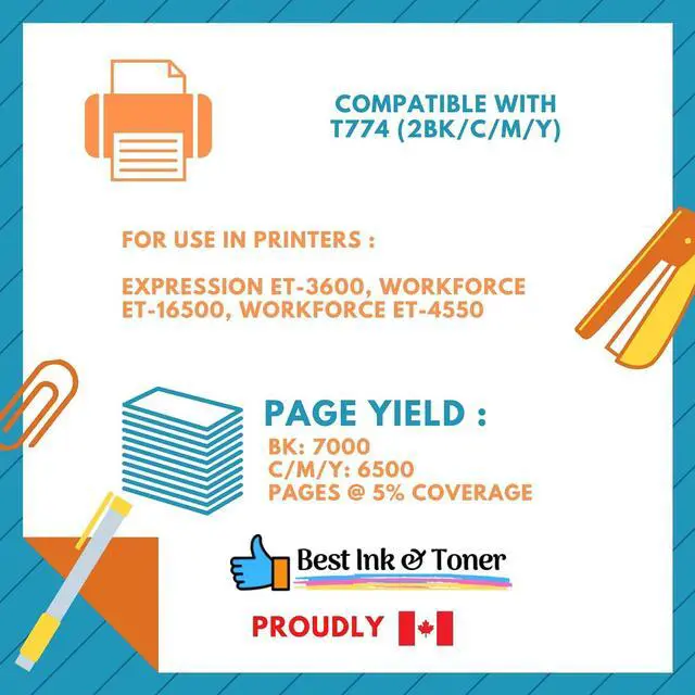 For use in Epson Expression Series :Expression ET-3600 & Epson - WorkForce Series : WorkForce ET-16500 , WorkForce ET-4550 AND Page Yield: Black upto 7000 Pages & Cyan , Magenta & Yellow upto 6500 Pages