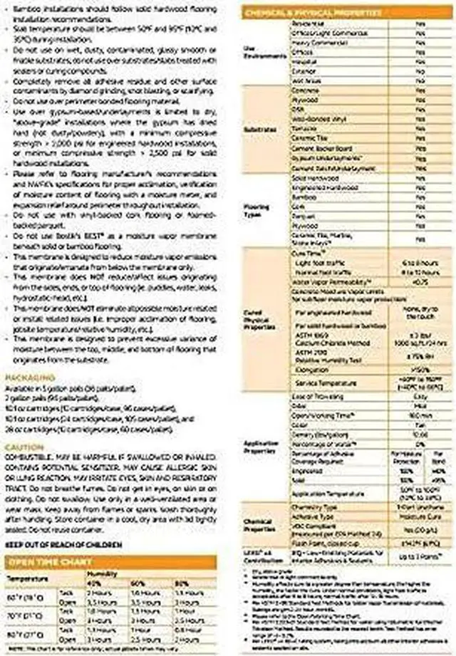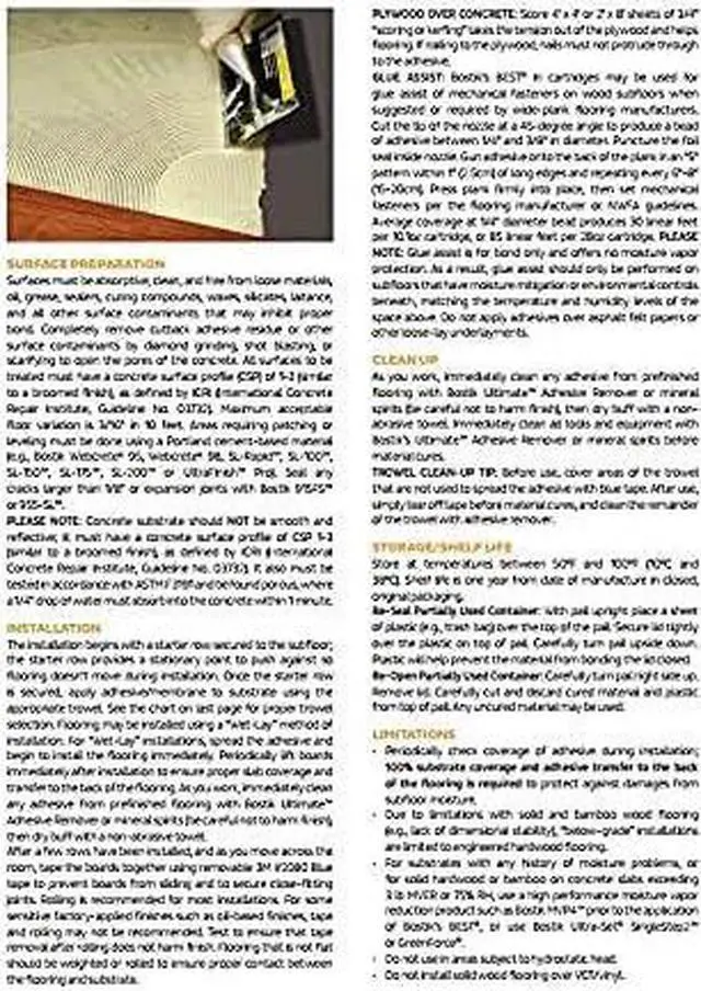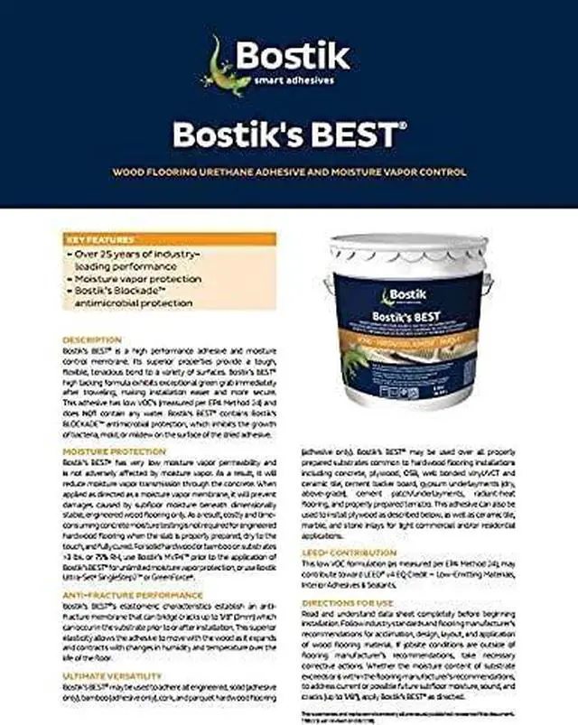 Bostik's BEST is a high-performance urethane adhesive and moisture control membrane that provides superior properties provide a tough, flexible bond to a variety of surfaces. Bostiks BEST high tacking formula exhibits exceptional green grab immediately after troweling, making installation easier and more secure.