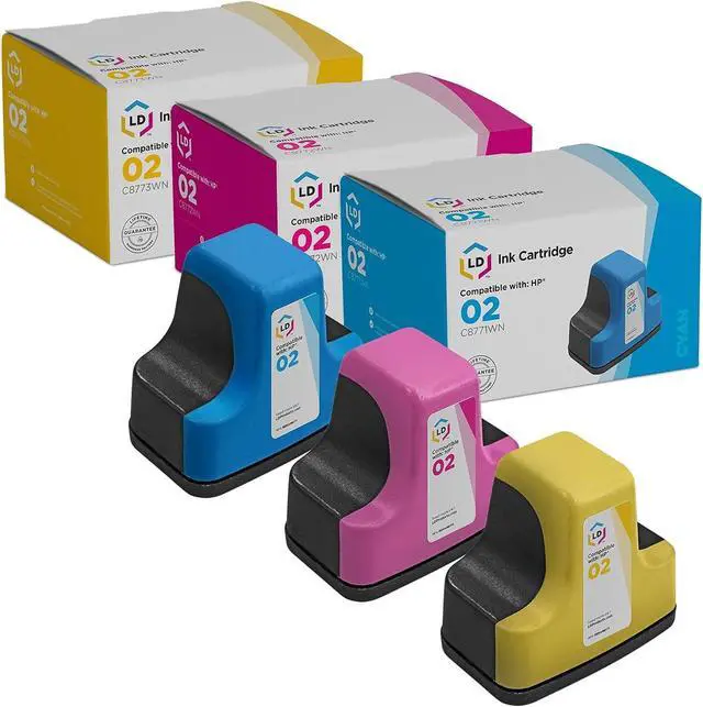 Package Contents: 3 Pack of Remanufactured Replacements for HP 02 Printer Ink Cartridges with 'smart chip' for easy ink level monitoring - 1 C8771WN Cyan | 1 C8772WN Magenta | 1 C8773WN Yellow