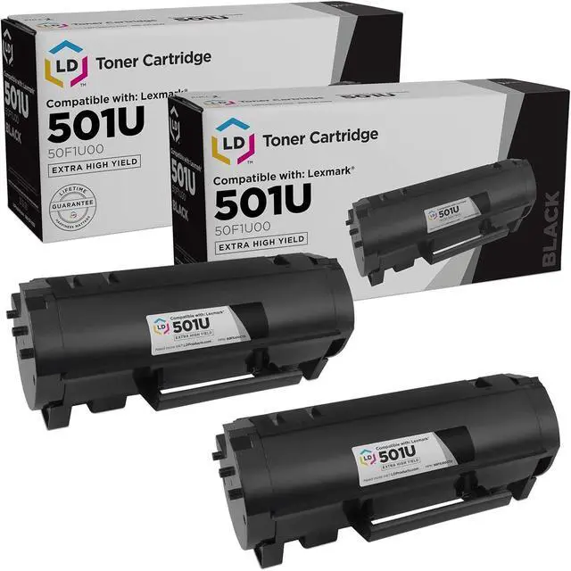 Save and print even more when you shop with LD Products! This offer includes (2) compatible toner cartridge replacements for Lexmark 501U 50F1U00 Ultra High Yield Black. Compatible with Lexmark MS printers: MS510dn, MS610de, MS610dn, MS610dte, and MS610dtn. Please note, retail packaging may vary, and these cartridges will only work with printers purchased within the United States and Canada. The use of replacement cartridges and supplies does not void your printers warranty. Professionally manufactured by LD Products.