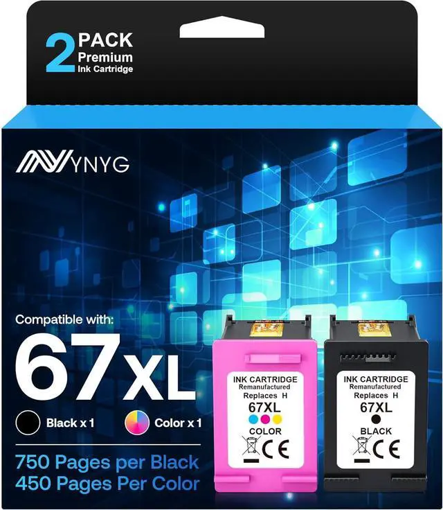 Package Contents: NYNYG 67xl printer ink for hp 67, 2 pack ink cartridge replacements for 67xl (1 black & 1 tri-color).