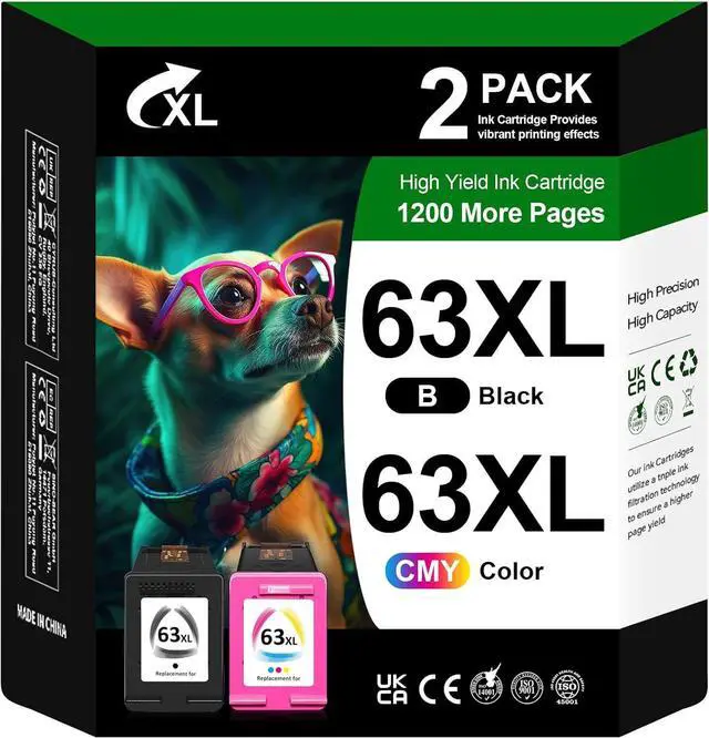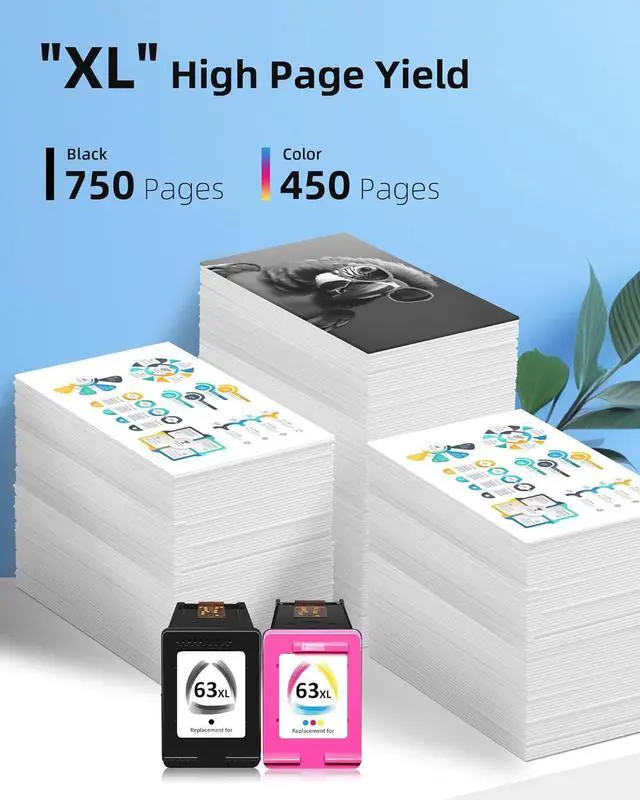 Lager capacity & More PagesOur 63xl ink for HP can provide higher yield pages than standard 63 ink cartridge. Up to 750 Pages per 63XL Black and 450 Pages per 63XL Tri-color Ink Cartridge (Yields are based on ISO 24711 in default mode)