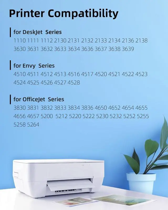 Printer CompatibilityFor HP DeskJet 1112 2130 2132 3630 3631 3632 3633 3634 3636 3637 3639 1110 1111 2131 2132 2133 2134 2136 2138; for HP ENVY 4511 4512 4513 4516 4520 4522 4524 4510 4517 4521 4523 4525 4526 4527 4528; for HP OfficeJet 3830 3831 3833 3836 4650 4652 4654 4655 5212 5222 5230 5232 5255 5260 5264 5200 5220 5252 5258 3832 3834 4656 4657 Printer