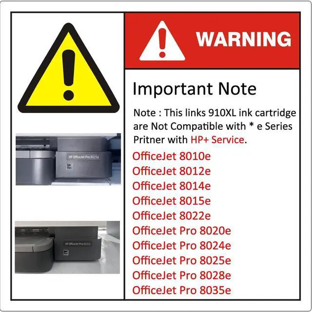 Incompatible with any *e series printers included OfficeJet 8010e, 8012e, 8014e, 8015e, 8022e,OfficeJet Pro 8020e, 8024e, 8025e, 8028e,8035e Printer. If your printer model is one of these printers, please don't purchase our products. they won't work with your printer