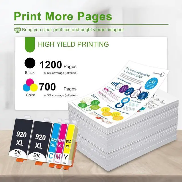 High Page Yield: 1,200 pages per Black 920XL ink cartridges, 700 Pages per Cyan 920XL, Magenta 920XL, Yellow 920XL (based on 5% coverage)
