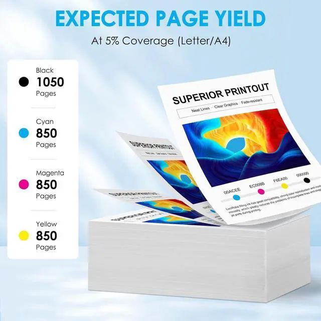 Page Yield: 1,050 pages per Black, 850 pages per Cyan Magenta Yellow, at 5 percent Coverage of A4 letter.