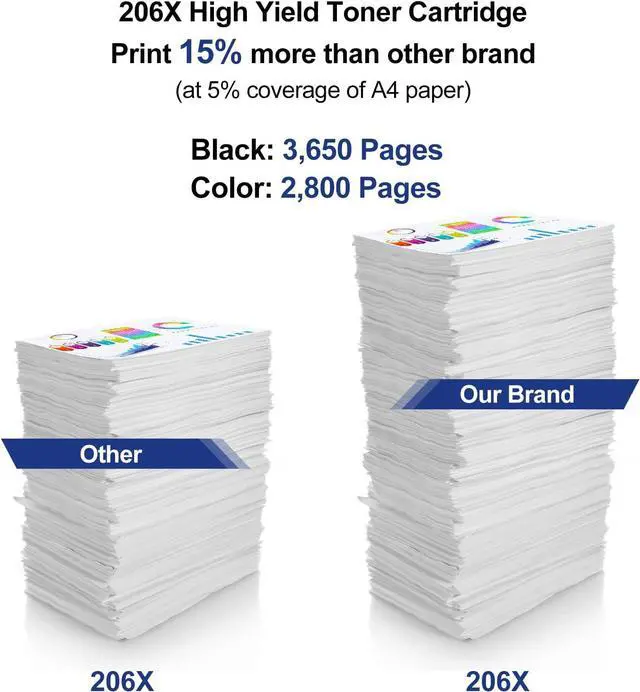 High Page Yield: Up to 3,650 Pages per 206X Black Toner Cartridge; 2,800 Pages per 206X Color Toner Cartridge (Letter A4, at 5% coverage)