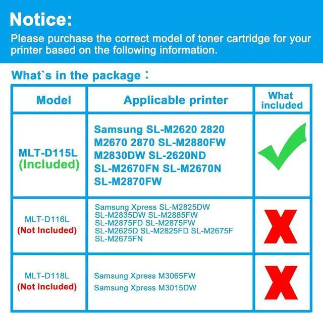 • Compatible PrintersReplacement for Samsung SL-M2620 SL-2820 SL-M2670 SL-2870 SL-M2880FW SL-M2830DW SL-2620ND SL-M2670FN SL-M2670N SL-M2870FW