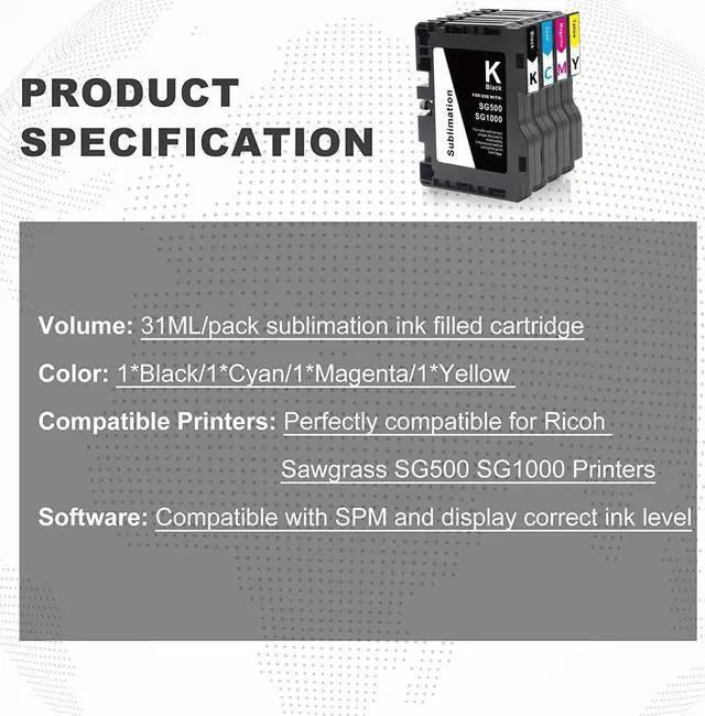 Compatible Printer Models: Strict inspect testing and the Newest Upgraded Chip, perfectly suitable for Sawgrass SG500 and SG1000 printers.