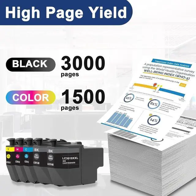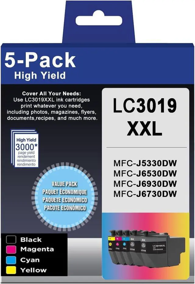 High Yield: 3000 pages per LC3019 black ink cartridge and 1500 pages for LC3019 color ink cartridge High Yield Ink Cartridge (Letter/A4, at 5% Coverage)