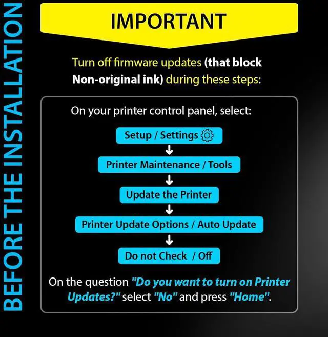 A firmware update is a software upgrade for your printer's system, designed to block non-original ink. We recommend avoiding any firmware updates to ensure uninterrupted printing performance. This is crucial for all compatible brands.