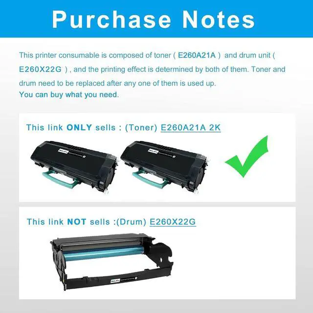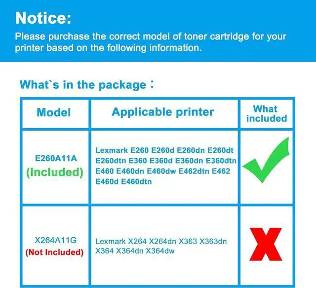 Toner cartridge(E260A11A) and Toner cartridge (X264A11G) look similar, but they work with different machines. Please refer to the second product image before purchasing, which can ensure that you are purchasing the correct toner model.