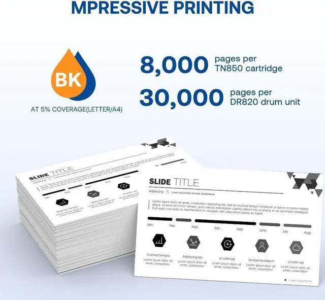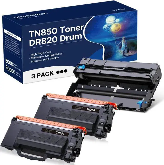 Product Content: 2 Pack TN850 Black Toner Cartridge + 1 Pack DR820 Black Drum Unit. TN850 Toner Cartridge and DR820 Drum Unit Compatible for Brother TN850 TN-850 DR820 DR-820.