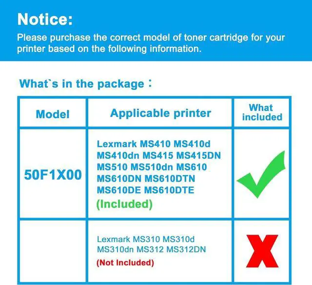 • Compatible PrintersReplacement for Lexmark MS410/MS410d/MS410dn/MS415/MS415DN/MS510 MS510dn/MS610/ MS610DN/MS610DTN/MS610DE/MS610DTE