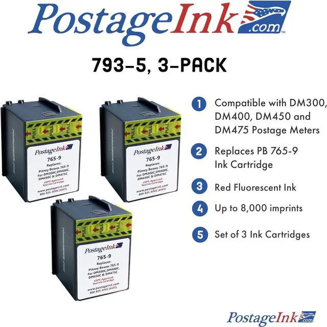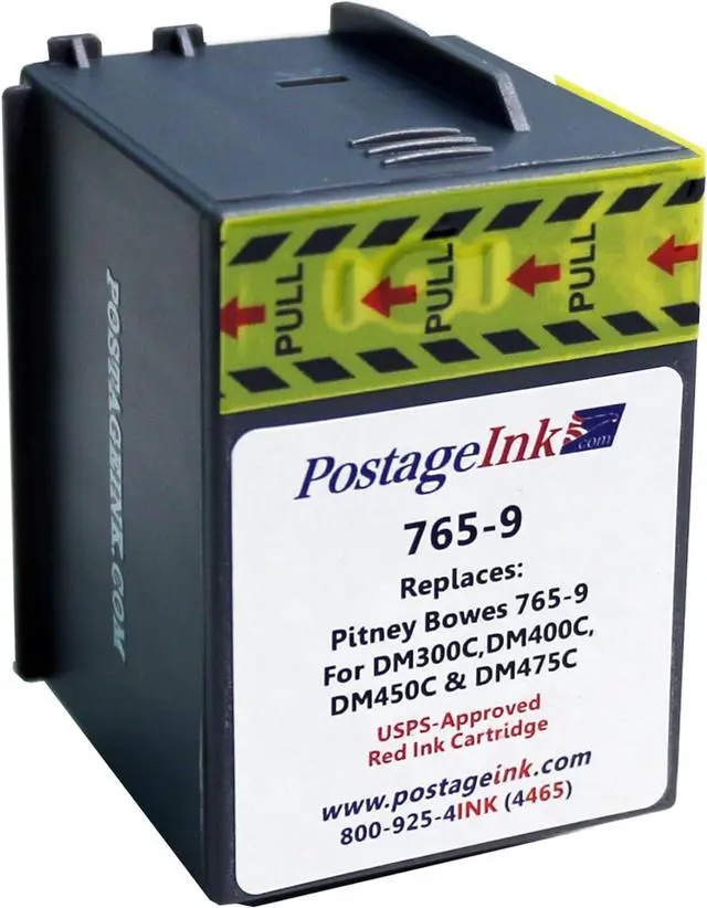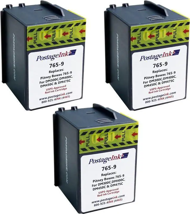 This set of 3 non-OEM ink cartridge is compatible with SendPro C Auto, DM300c, DM400c, DM450c and DM475c mailing machines. This cartridge replaces the original manufacturer 765-9 ink cartridge in USPS-Approved red fluorescent ink and provides up to 8,000 imprints per cartridge.