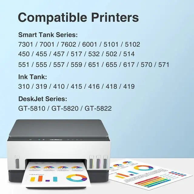 Compatible Printers: Compatible hp 32xl black ink bottle replacement for HP Smart Tank 7301 7001 7602 6001 5000 5101 450 455 457 517 532 502 514, Plus 551 555 557 559 651 655 617 570 571, Ink Tank 310 319 410 415 416 418 419, DeskJet GT-5810 GT-5820 GT-5822.