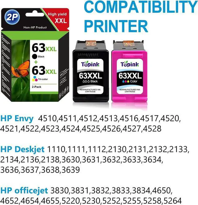 For HP Ink 63XL XXL Package Contents: 2-Pack Remanufactured TOPINK 63 ink cartridges ( 1 Black & Tricolour) 1 Installation Guide