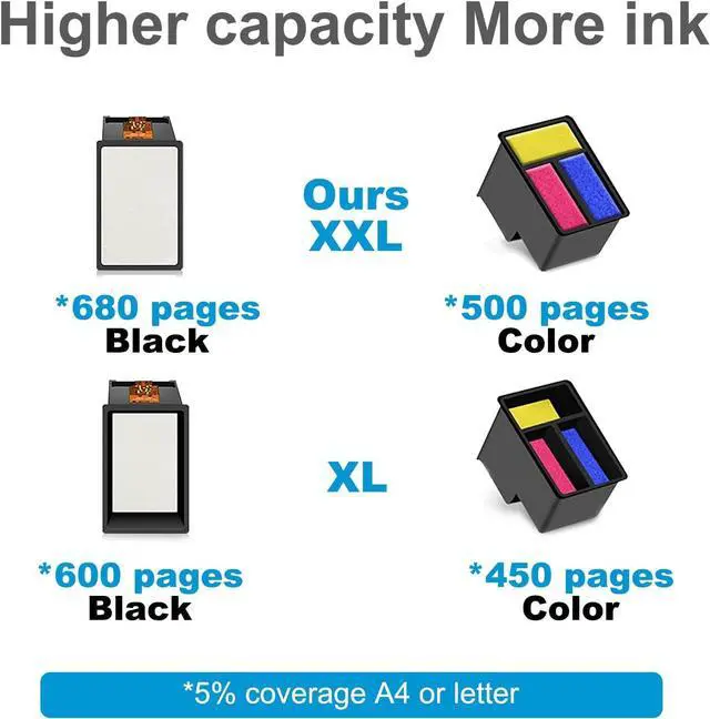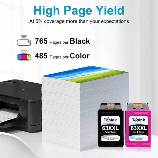 63XL XXL Ink Cartridge Black and Colour Save up to 50% with XXL Page Yield765 Pages for hp 63xl black ink cartridge,485 Pages for hp 63 color ink cartridge ink at 5% coverage. (Use high-density and high-capacity sponges to increase ink inventory by 2-3 times. )
