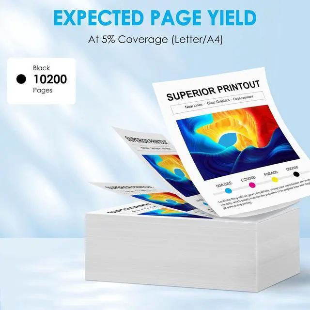 High Page Yield: 10,200 pages per cartridge, at 5 percent Coverage of A4 letter.