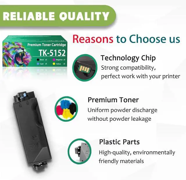 Compatible printers For Kyocera ECOSYS M6535cidn M6035cidn P6035cdn printers. Toner volumes TK-5152 Black toner cartridge: 12,000 pages. TK-5152 Cyan toner cartridge: 10,000 pages. TK-5152 Magenta toner cartridge: 10,000 pages. TK-5152 Yellow toner cartridge: 10,000 pages. Package Contents: TK-5152 Black toner cartridge 1 pack. TK-5152 Cyan toner cartridge 1 pack. TK-5152 Magenta toner cartridge 1 pack. TK-5152 Yellow toner cartridge 1 pack. Product Information: Each toner cartridge weighs 1kg and measures 34cm *15cm *15cm. Printing experience: This toner cartridge print is stably tested, provides outstanding results with clear fonts and realistic images, and ensures delivery of keentext and vivid bright color. Stable output, easy to install, ready to use, safe and environmentally friendly, giving you a healthy environment. Warm 1. Due to the different toner cartridge models in different regions, please confirm your toner cartridge model and send us a photo of your printer when you buy a toner cartridge. (Prevent buying a toner cartridge that is not compatible with your printer) 2. Make sure not to touch the chip on the toner cartridge to get the best performance. 3. Please note that if prompted with a non-original message, simply click OK or Continue to continue and start using the toner cartridge.
