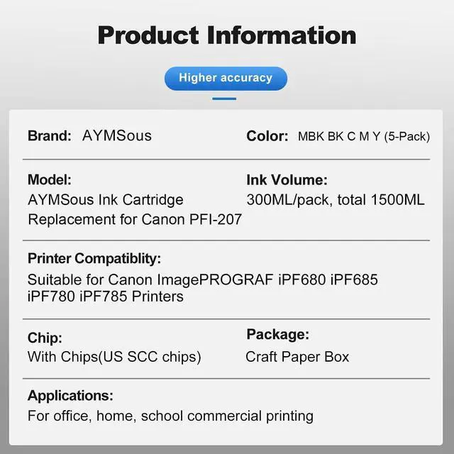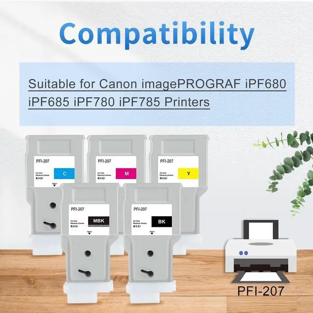 AYMSous compatible Canon PFI-207 ink cartridge are perfectly fit for CanoniPF680 iPF685 iPF780 iPF785 Printers, protect your printer from being damaged, its your good choice for home and business printing. Easy to use. Provide economical and professional ink that can last for a long time with colorful and clear printouts.