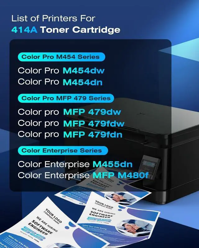 Compatibility Model : 414A Black Toner Cartridge for HP 414A 414X works well with HP Color Laserjet Pro MFP M479fdw M479fdn M479dw M479dw, Color Pro M454dw M454dn, Color Pro MFP M479 M454, Color Enterprise M455dn, MFP M480f laser printer