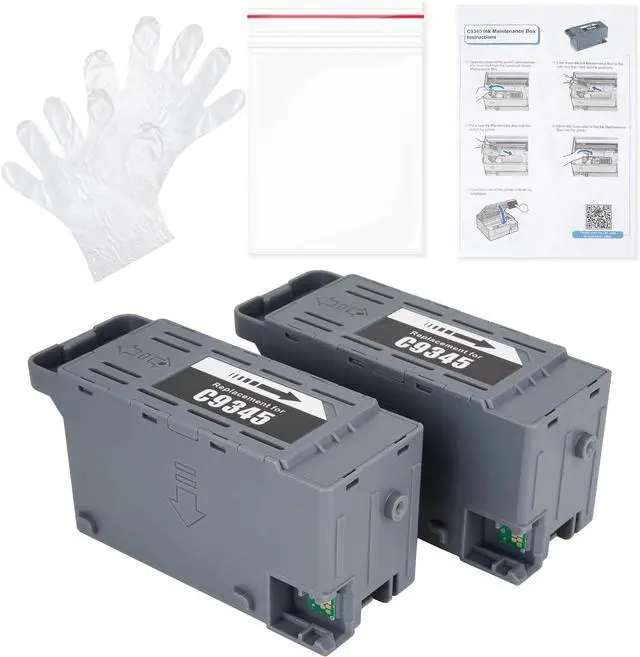 What In The Box2 pcs C9345/ PXMB9/ C12C934591 Ink maintenance box with latest smart chip,1 instruction sheet, 2pairs of disposable gloves, 2 transparent resealable poly bags.