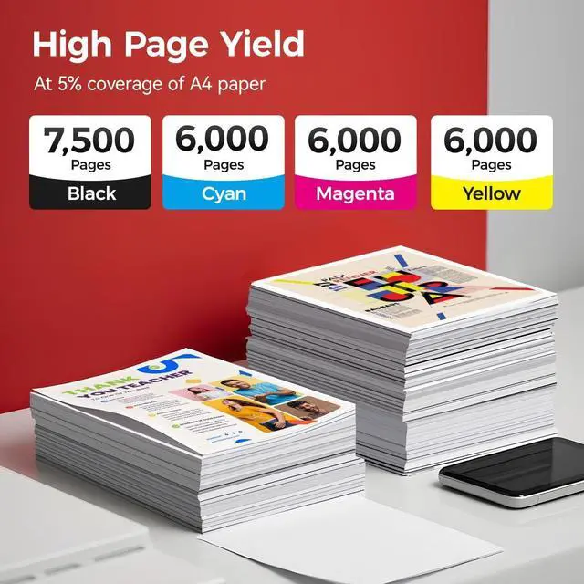 Page yield: 7,500 pages black and 6,000 pages per color toner cartridge for HP (at 5% coverage of A4 paper).