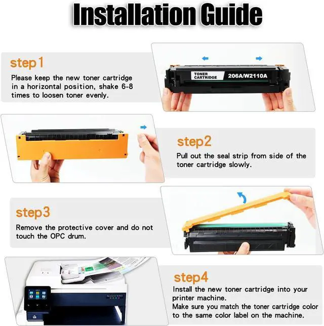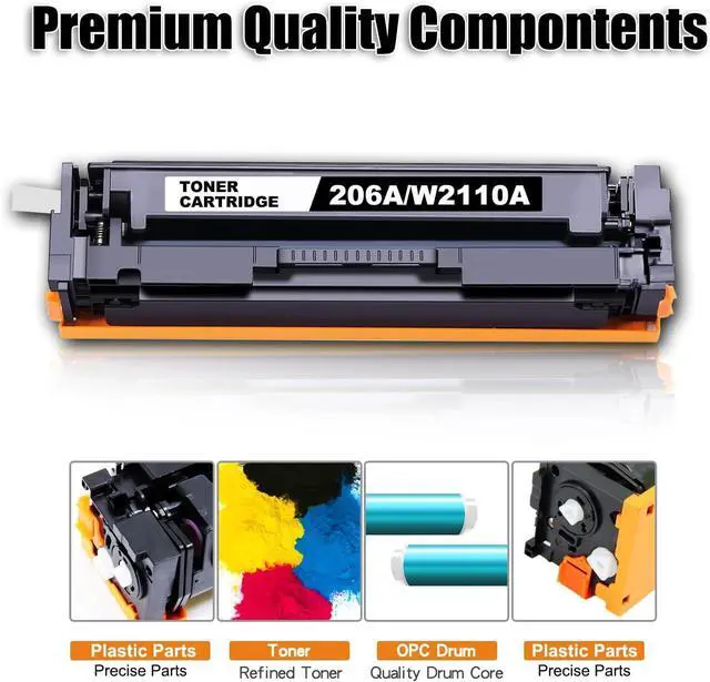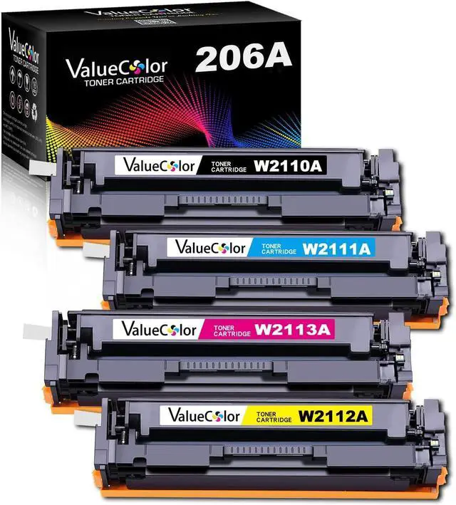 Packing Contents: 4 Pack compatible 206A toner cartridge, 1x W2110A Black, 1x W2111A Cyan, 1x W2112A Yellow, 1x W2113A Magenta.