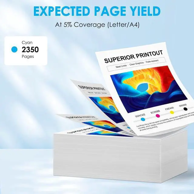 High Page Yield: 2,350 pages per Cyan, at 5 percent Coverage of A4 letter.