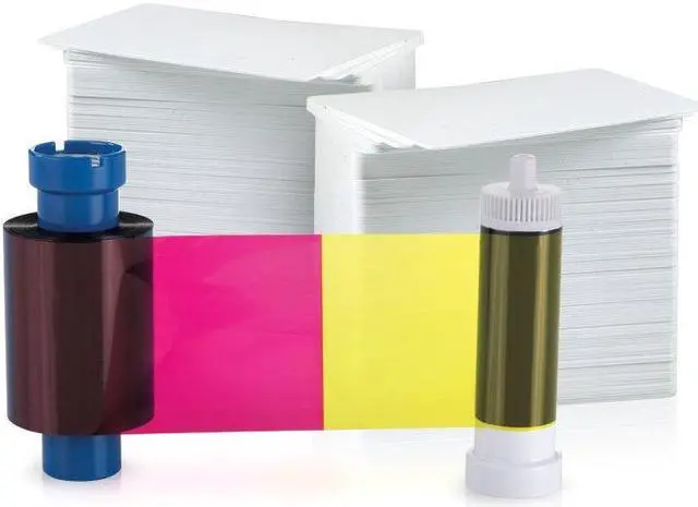 This premium alpha card Series YMCKOK Ribbon prints high quality, dual-sided ID cards - full color ID with a clear overcoat panel for use with the alpha guard watermark system on the front, and monochrome black on the back. Pack also includes 300 premium alpha card blank ID cards. Compatible with alpha card Compass printer.