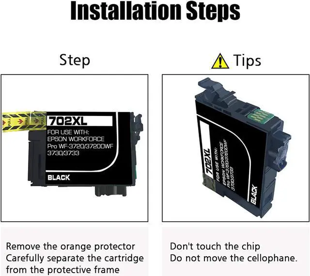 NoahArk Remanufactured Epson 702XL T702XL Ink Cartridges Compatible Models : High Capacity Remanufactured for Epson 702XL ink cartridges: Easy to install for our users Excellent quality with high yields. If printer appears "Low/Empty Ink/Expiration" or other error messages, please click "Yes/OK/Next" to continue.