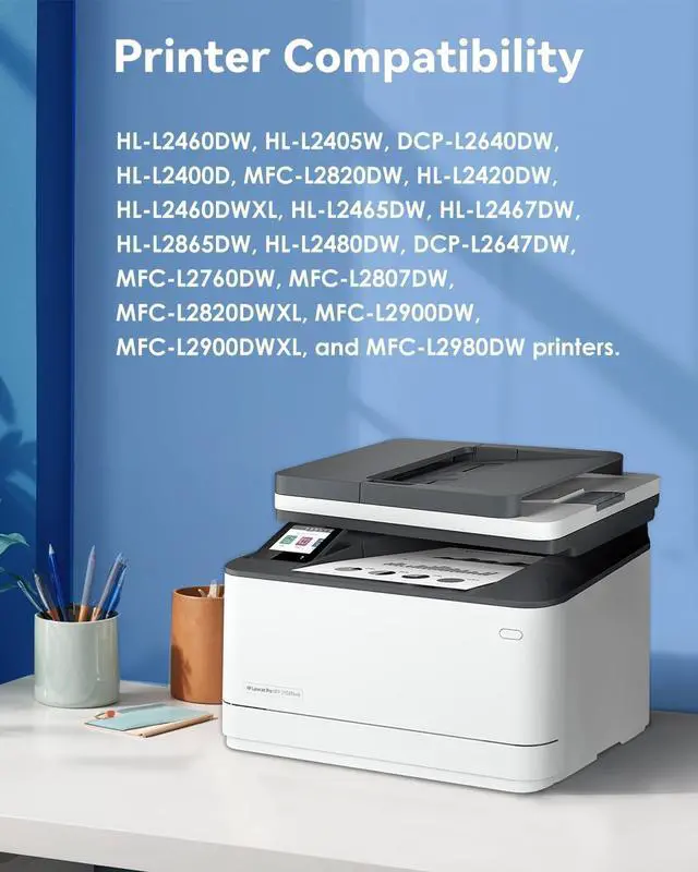 Compatible Printers:HL-L2400D HL-L2405W HL-L2420DW HL-L2460DW HL-L2460DWXL HL-L2465DW HL-L2467DW HL-L2480DW HL-L2865DW; DCP-L2640DW DCP-L2647DW; MFC-L2760DW MFC-L2807DW MFC-L2820DWMFC-L2820DWXL MFC-L2900DW MFC-L2900DWXL MFC-L2980DW