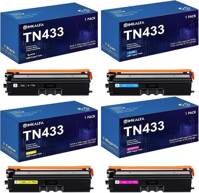 Package Contents: Inkalfa Compatible Toner Cartridges Replacement for Brother TN433 TN-433 TN433BK TN433C TN433M TN433Y High Yield 4 Packs Toner Cartridge