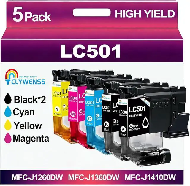 CLYWENSS LC501 Ink Cartridges Replacement for Brother LC501 LC 501 XL LC501BK LC501C LC501M LC501Y for MFC-J1260DW MFC-J1360DW MFC-J1410DW Printer (2 Black, Cyan, Magenta, Yellow, 5-Pack)