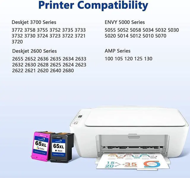 65XL ink Cartridge Compatible with: AMP 100 120 125 130 ; DeskJet 2600 2620 2621 2622 2623 2624 2625 2628 2630 2632 2633 2634 2635 2636 2652 2655 3720 3721 3722 3723 3724 3730 3732 3733 3735 3752 3755 3758 5025 ; Envy 5010 5012 5014 5020 5030 5032 5034 5052 5055 5058 printers