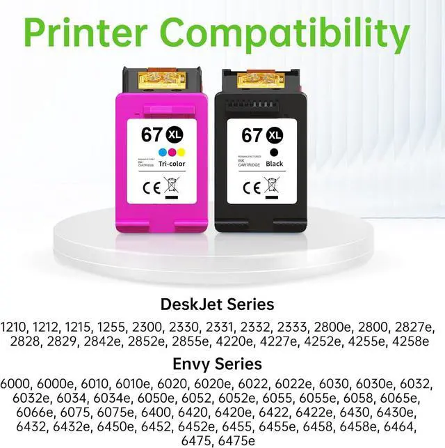 67XL Ink Cartridges Page Yield:compatible for HP 67xl ink cartridges black/color combo pack compatible for DeskJet 2700, 2700e, 2710, 2710e, 2720, 2720e, 2721, 2721e, 2722, 2722e, 2723, 2723e, 2724, 2725, 2729, 2732, 2734e, 2742e, 2752, 2752e, 2755, 2755e, 2800e, 2800, 2820, 2821, 2821e, 2822, 2823, 2828, 2829, 2842e, 2852e, 2855e,1210, 1212, 1215, 1255, 2300, 2330, 2331, 2332, 2333 Printer